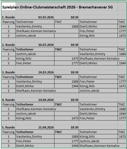 Im vergangen Jahr hatten wir gegen die Mannschaft noch 2½:5½ verloren. Nominell ist Werder 5 mit DWZ 1837 die zweistärkste Mannschaft der Stadtliga. Nur LHW 1 (DWZ 2048) liegt verlustpunktfrei auf Platz 1. Ziel der Mannschaft war es durch ein gutes Ergebnis die Abstiegsgefahr in der Saison endgültig zu bannen.