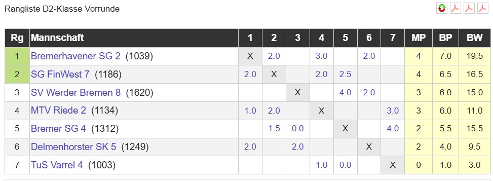 Werfen wir einen Blick auf die Tabelle der D2-Klasse. Die Aussichten einen Finalrundenplatz (1./2.) zu erreichen. Der nächste Gegner am 18.01., Varel 4, ist zurzeit Tabellenletzter. Entscheidend wirddas Spiel in Runde 5. Anfang Februar gegen Werder 8 zum dem wir in stärkster Aufstellung antreten werden.