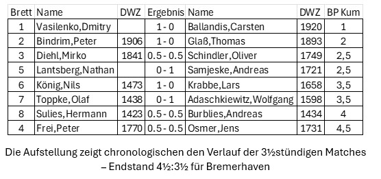 Ein Blick auf die Partien der Begegnung Bremerhaven 2 – Werder 8 verrät, dass das Match knapper war, als ein 1:3 vermuten lässt.
