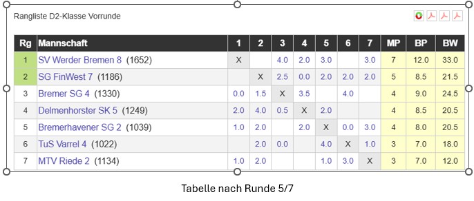 Der Kampf um Platz 2 entscheidet sich nun wahrscheinlich zwischen BSG 4 und Delmenhorst 5. FinWest 7 liegt zwar noch vorne auf Platz 2. Die Mannschaft hat aber ein ausstehendes Spiel weniger. Werder 8 hat bereits zwei Mannschafts- und drei Brettpunkte Vorsprung auf den 2. Platzierten und die Finalrunde so gut wie sicher erreicht.