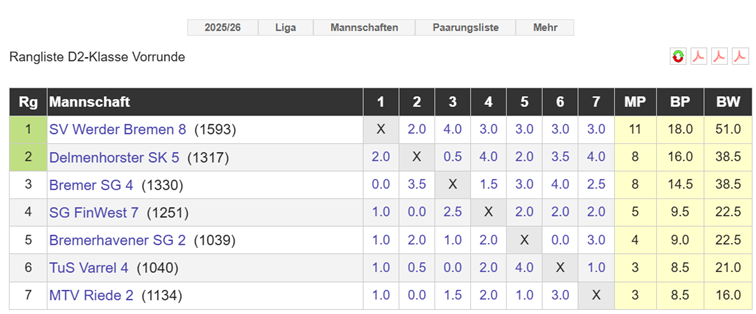 Fristgerecht sagte Delmenhorst 3 das Spiel telefonisch beim Mannschaftführer ab. Die Spieler konnten rechtzeitig informiert werden, so dass keine Leefahrten entstanden. Das Spiel wurde 8:0 für uns gewertet. Bisher sind in der Saison 25/26 in der Stadtliga zwei Matches komplett ausgefallen.