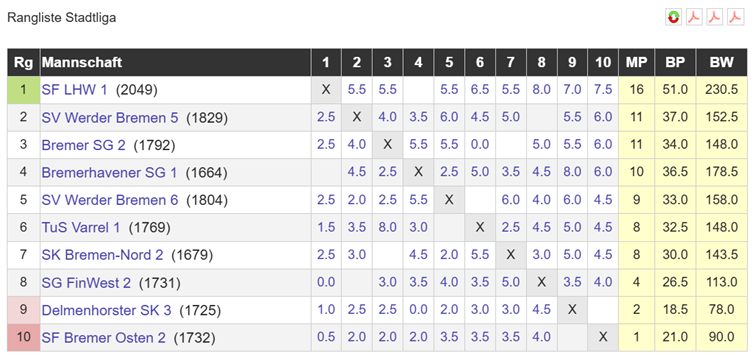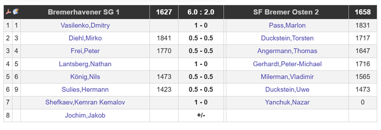 In der letzten Runde spielen Varrel – Werder 6 und Bremen Nord 2 – BSG 2. Es spricht daher viel dafür, dass wir uns auch bei einer Niederlage gegen SF LHW 1 in der oberen Tabellenhälfte, auf Platz 5 halten können, da der Vorsprung an Brettpunkten auf die Platze 6 und 7 groß ist. Wahrscheinlich landen wir auf Platz 5, da Werder 6 bei einem Sieg gegen Varrel uns noch überholt.