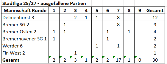 Von 10 Bremer Mannschaften mussten sechs mindestens einmal ein Brett frei lassen. 2 Wettkämpfe komplett aus (8). Dies entspricht einer Ausfallquote von 8,33%. Logischerweise befinden sich die Mannschaften mit hohen Ausfallquoten am Ende der Tabelle. Vier Teams konnten immer komplett antreten..