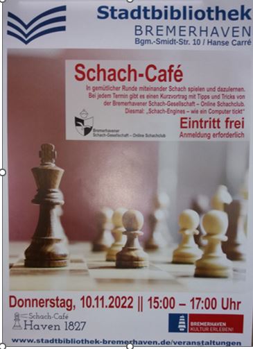 Das Schach-Café 2022 war eine zwölfteilige, kostenlose Veranstaltungsreihe, die im Frühjahr und Herbst 2022 von der Bremerhavener Schach-Gesellschaft jeweils Donnerstag 15:00 – 17:00 mit Unterstützung und in der Stadtbibliothek durchgeführt wurde.